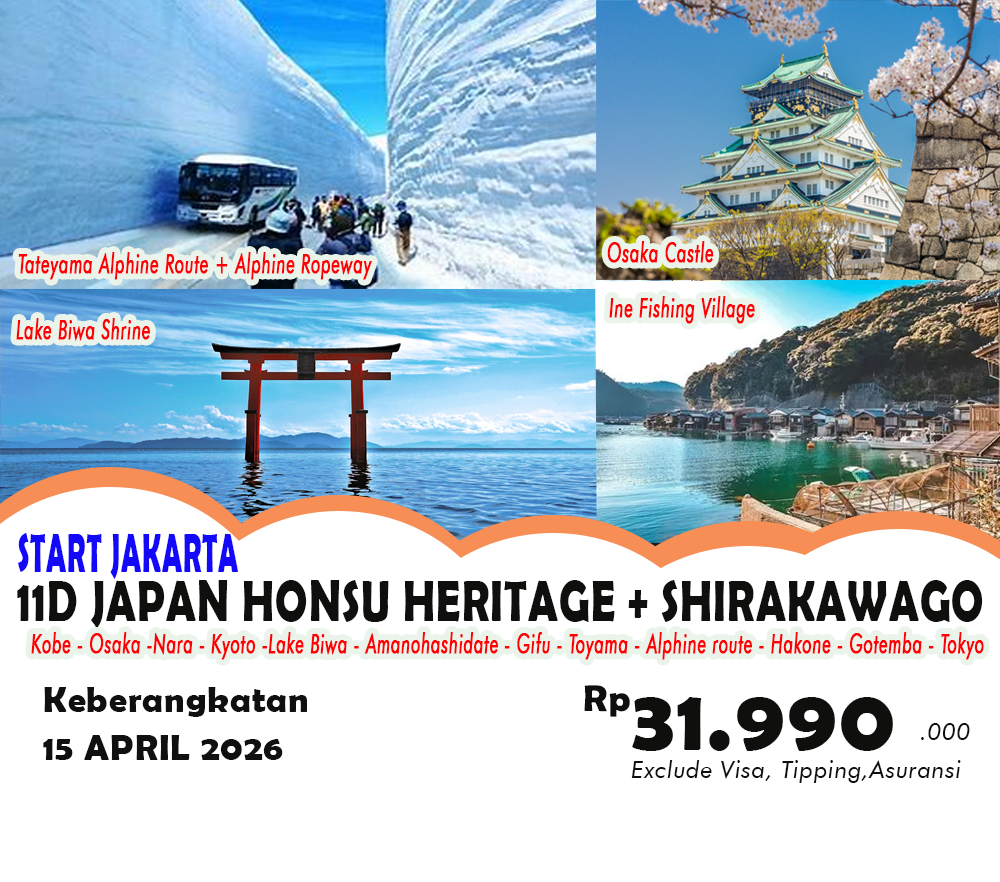 SHIRAKAWAGO VILLAGE + TATEYAMA ALPINE ROUTE + LAKE BIWA + KOBEHarga Tour : Rp 31.990.000